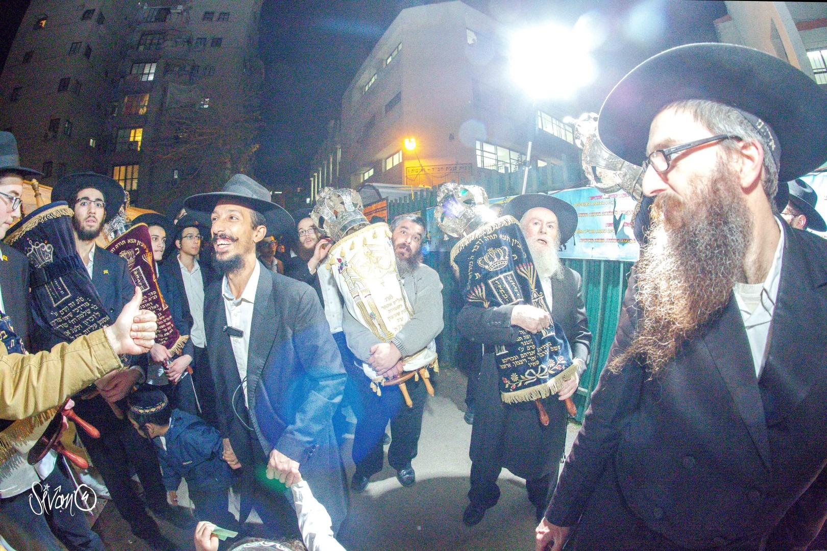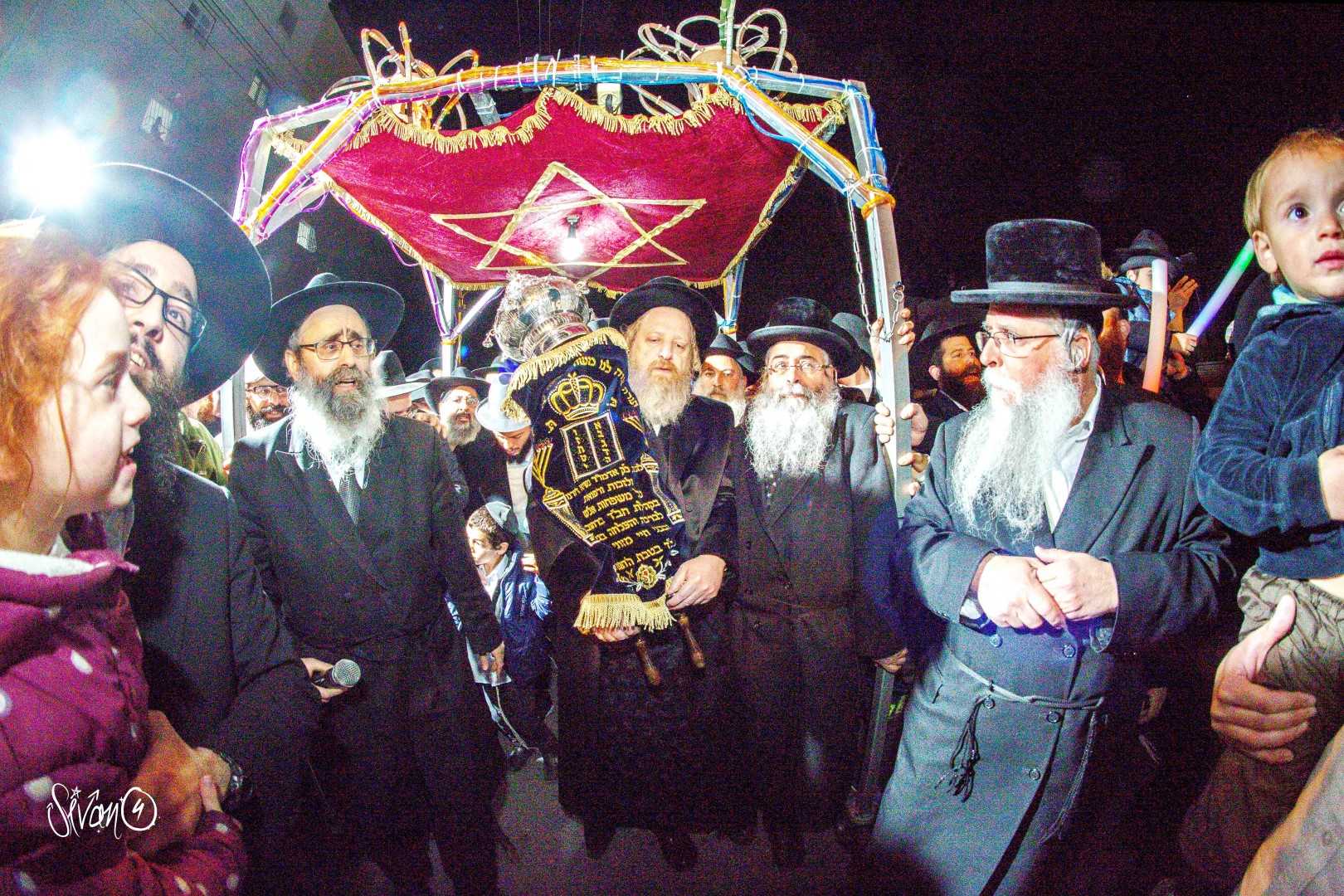 התהלוכה יצאה מבית הספר לבנות. אנשים נשים וטף צעדו לאורך רחוב מדר בשירה וריקודים. תחת החופה נישא ספר התורה ע”י חברי הקהילה ולפניו רכב מיוחד שהשמיע את ניגוני חב”ד שמחים ובראש התהלוכה צעדו ילדי התלמוד תורה עם לפידי אש בידם. בחצר בית הכנסת המרכזי חיכו לספר התורה החדש כל ספרי התורה ויחד נכנסו להקפות באולם בית הכנסת הגדול ברוב שירה וזימרה.
